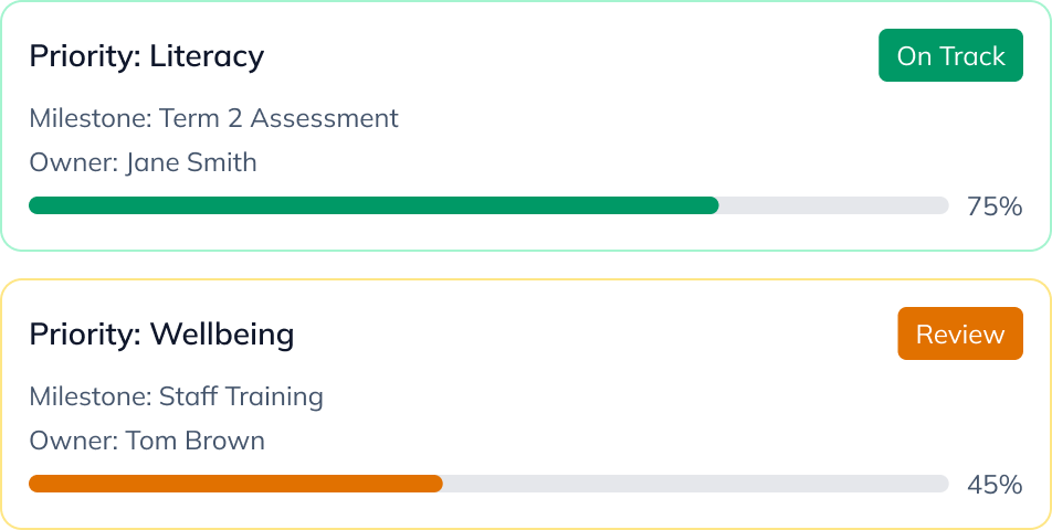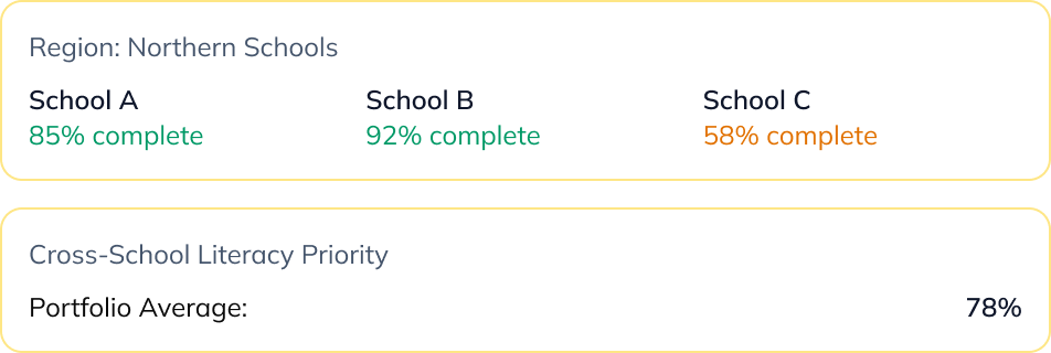 See how schools within a portfolio are progressing on similar improvement priorities, identifying strong practice, variance, and where additional support may be needed.