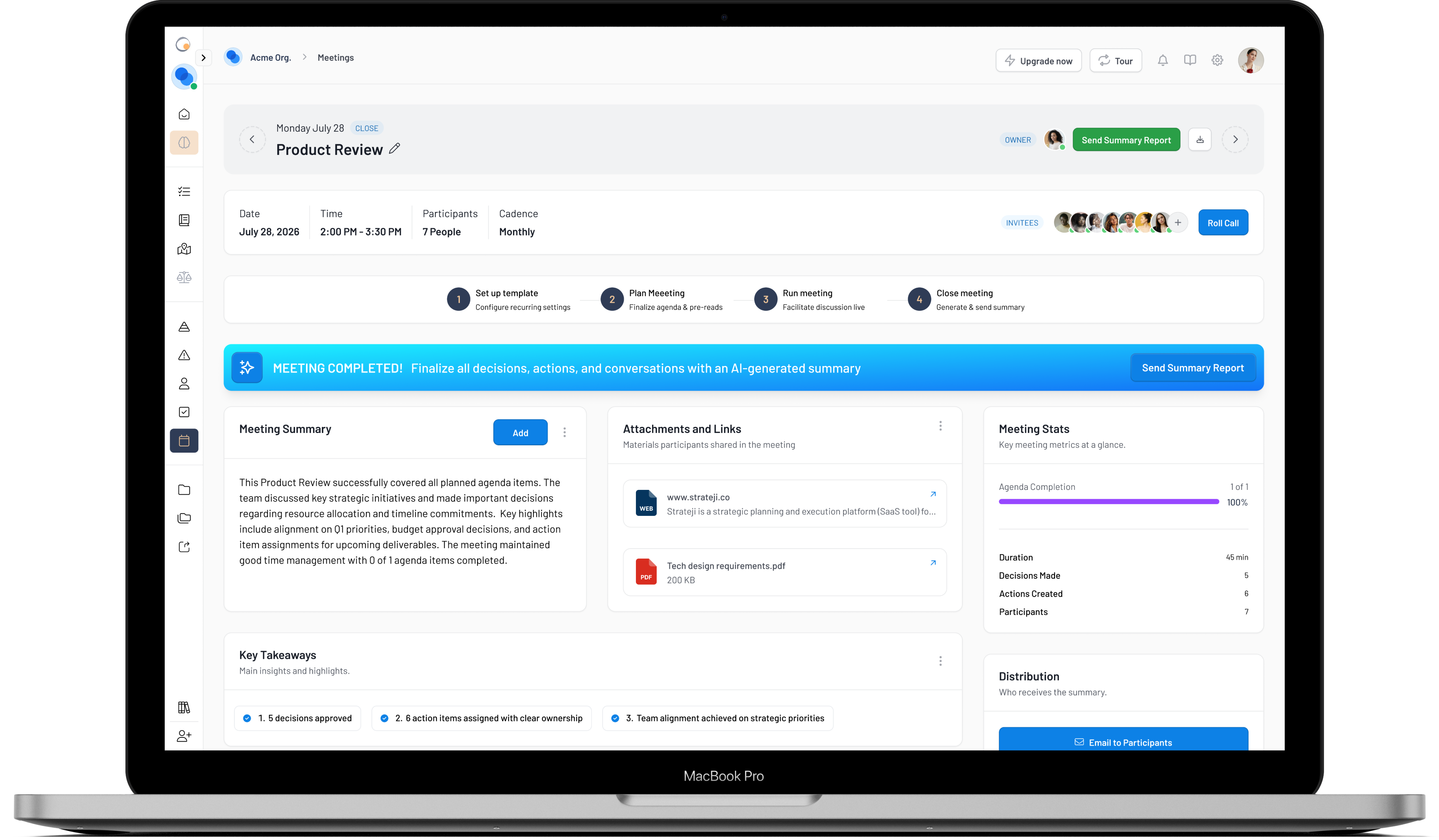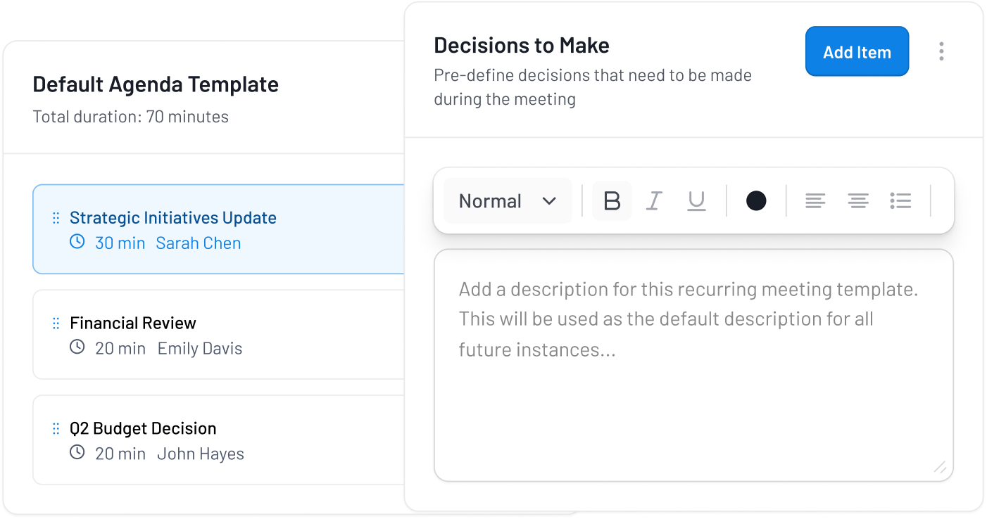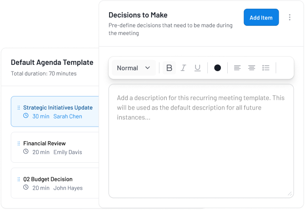 Track upcoming meetings, review past decisions, and manage follow-up actions seamlessly.